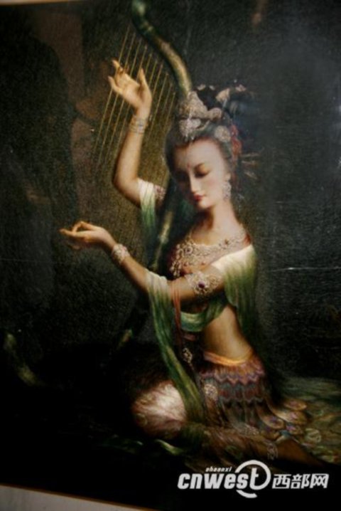 她的作品,很有油畫的感覺,在昏暗的燈光下幾乎分不清楚。
