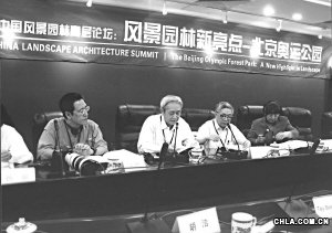 2007年5月14日中國風(fēng)景園林高層論壇在北京舉行。北京清華城市規(guī)劃設(shè)計(jì)研究院院長尹稚(左一),中國風(fēng)景園林協(xié)會(huì)秘書長甘偉林(左二),中國風(fēng)景園林協(xié)會(huì)理事長周干峙(右二),國際風(fēng)景園林師聯(lián)合會(huì)主席戴安妮·孟賽斯博士(右一)參加了論壇。