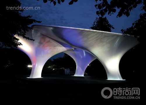扎哈·哈迪德在倫敦設計的0Serpentine美術館展臺,由三座傘狀結構組成。