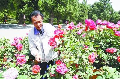 天壇公園的月季園,應該算得上是北京市最早的一個月季專類園。建國初期,在“月季夫人”蔣恩鈿女士的幫助下,天壇公園建立了當時全國品種最為齊全、規模最大的月季專類園。從1976年開始,在中國農業大學哈貴教授的指導下,李文凱和他的師傅劉好勤開始對月季進行育種研究。他們運用常規雜交、輻射誘變等技術,一遍一遍反復進行試驗。有時為了觀察細微的變化,積累試驗數據,李文凱經常不分晝夜地盯在花圃,連續幾個月都不回家。在進行輻射誘變育種時,由于經常接觸輻射源,嚴重影響了李文凱的身體健康,今年剛滿55歲的他,看上去遠比實際年齡蒼老得多。而李文凱卻詼諧地說:“能培育出這么漂亮的月季新品種,就是讓我再老10歲也值了。”