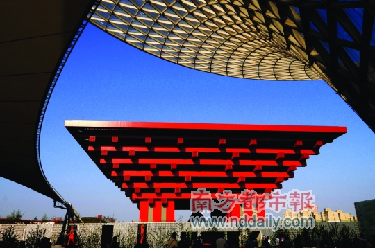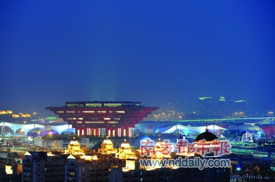 2010年5月3日,上海世博園中國館與世博軸交相輝映。 東方IC供圖