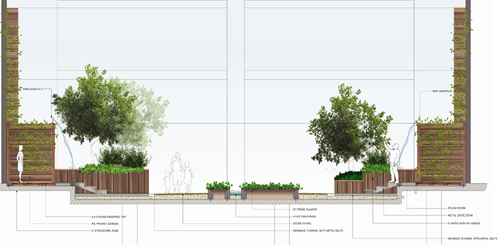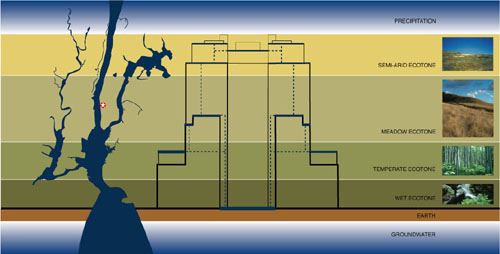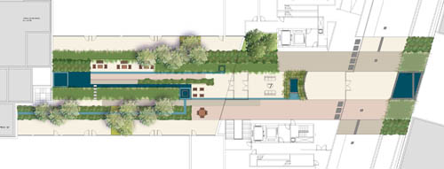 紐約Dirtworks景觀設計公司因受到建筑本身的名字:“分水嶺”的啟發,將流動的水作為住宅區內主要的設計元素。為了再現分水嶺的景觀,即湖水、河流、小溪組成的特別而縱橫交錯的風貌,Dirtworks公司正在開發一系列從屋頂到地面的跌水,并讓支流流入建筑的庭院、中心和大多數公共空間。