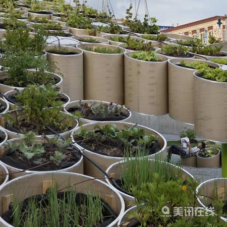 Public Farm 1(簡稱P.F.1)將娛樂與教育功能結合為一體,在分享種植食物的體驗的同時,為周圍創造一種社區的氛圍。結合可持續建設與可持續建筑,該項目將完全使用可回收利用材料建造并將100%依靠太陽能,以及使用雨水收集系統進行灌溉。它如一個展開的飛機造型,項目由硬紙筒組成,設計有可容納蔬菜、香和水果的種植花盆。大部分的硬紙筒被抬高以創造一個遮蔭天篷,一些硬紙筒則延伸至地表成為支柱,每個支柱有不同的功能:從提供座位到美化環境、從移動電話收費亭到農貿市場果汁吧均包括在內。