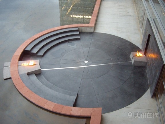 這條真北路線(Truenorth)位于美國亞利桑納州半圓形Tempe藝術中心的幾何中心處。這條軸線從地下延伸出來,沿著水流潛行,經過Papago Buttes山與駝背山的山腳,與外界更廣闊的環境連接起來。黑色水泥地面像是銀河一樣閃閃發光,這是由于120個分塊鑄造的樹脂桿有序排列的效果。