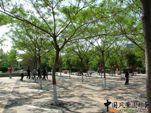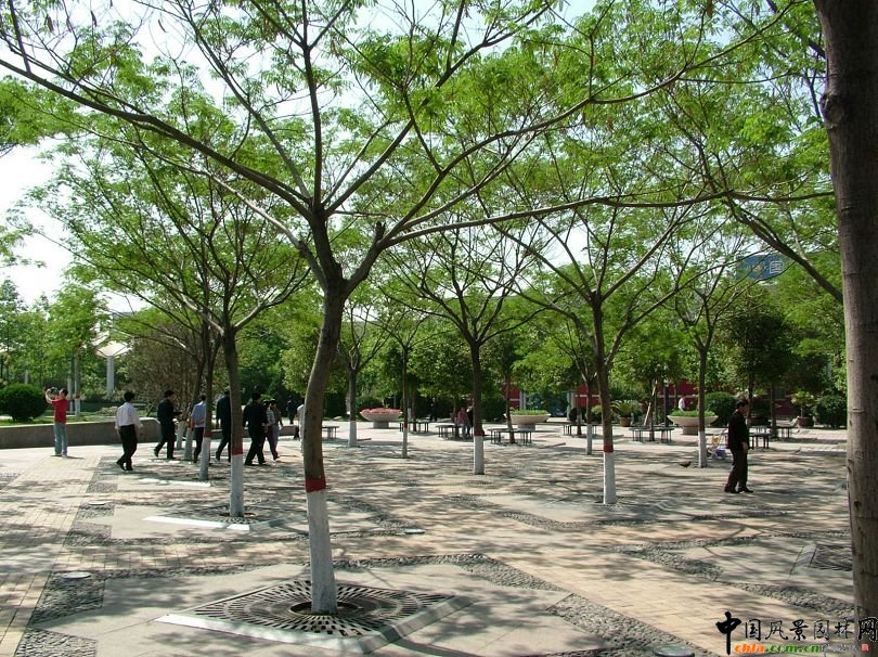 西部樹陣綠化區(qū),設(shè)計(jì)者可謂獨(dú)具匠心,將樹陣與兒童游樂有機(jī)地結(jié)合在一起,可使游人散步休閑,駐足歇息,兒童盡情嬉嬉,縱情玩樂,兒童游樂區(qū)的小畫家天地,每逢周末或節(jié)日,可供小畫家們舉辦畫展,現(xiàn)場(chǎng)比賽。出于安全考慮,兒童游樂區(qū)地面采用1.5厘米橡膠地墊鋪地。休閑樹陣地面鋪裝采用花崗巖與卵石和耐火磚相間,夜間在地?zé)粽丈湎拢碛幸环匀司跋螅翗淞钟?2棵柿子樹組成,到秋后,柿林果實(shí)累累,金黃色的柿子在片片紅的映襯下,分外妖嬈,可謂“金柿飄丹”。
