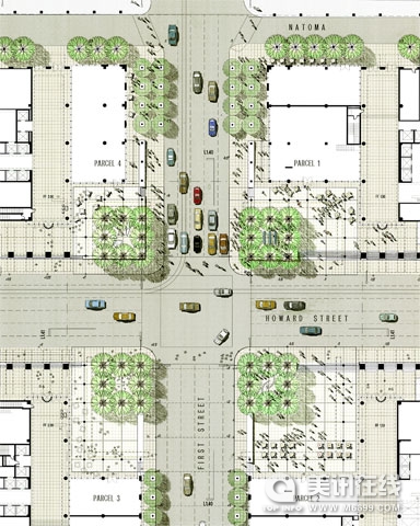 SWA首先研究了周圍的城市環境,然后制作了幾個設計方案。客戶在看過這幾個設計方案之后,選擇了其中一個設計方案。這個設計方案的設計風格和現有的背景環境迥然不同,場地周圍的建筑成為街墻,道路交叉口的四個角落被設計成小廣場。而這四個小的廣場又整體地合成一個大廣場,這個廣場里既有沿著廣場邊緣行走的人流,也有在中間穿流的車輛。此外,這個廣場還毗鄰海灣大橋,因此它也看起來像是進入海灣大橋的“入口”。