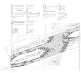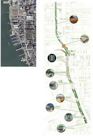 朝北看位于甘西沃特的入口。對在南部總站割裂的現狀進行修復,使得分層的構筑物和其上的景觀基礎設施得到展示。