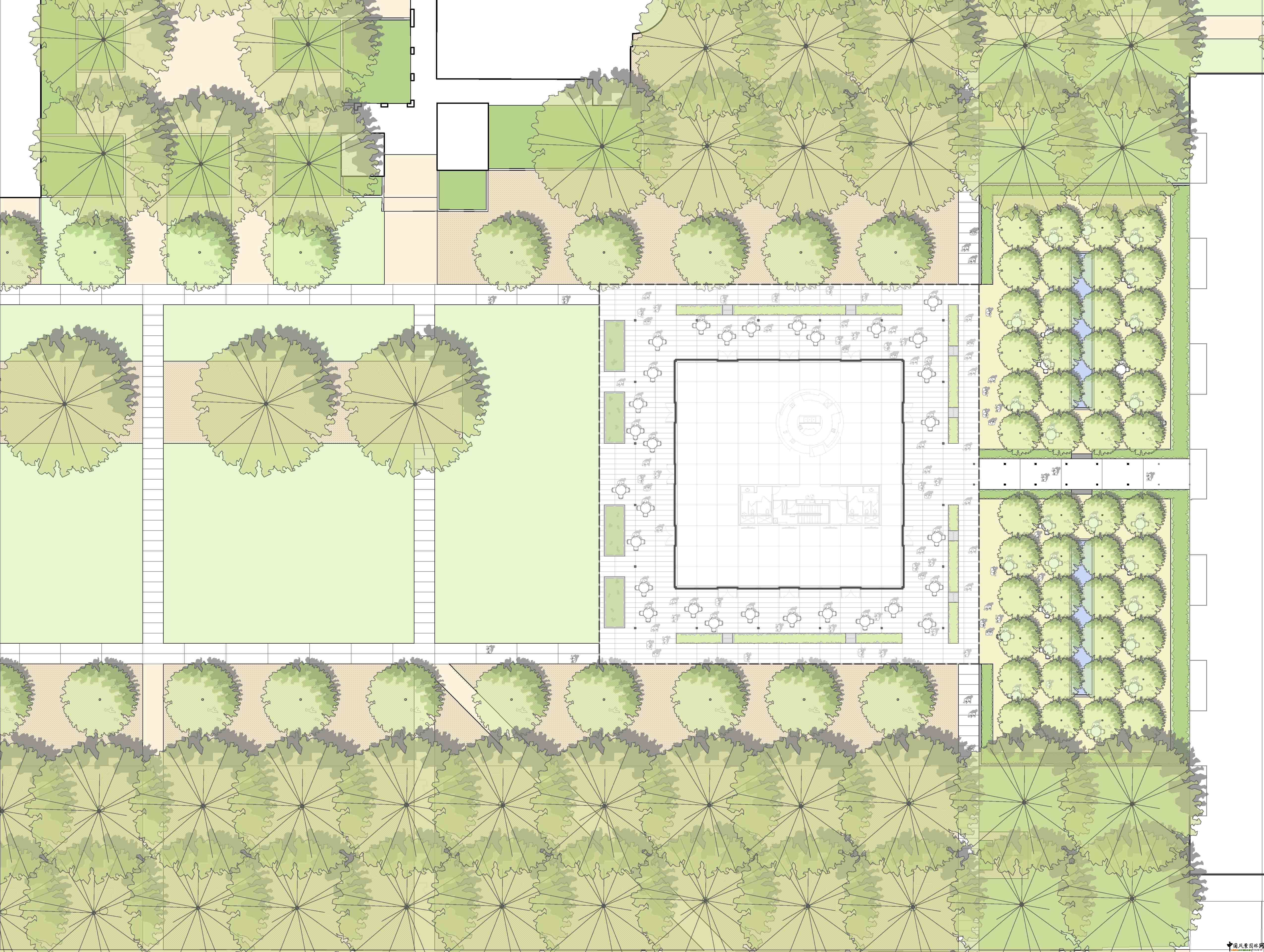 考慮到建筑物的光照,景觀設計師設置了最小的障礙。新的混凝土甬路和槲樹加強了院落現存的空間架構。澇原地帶要求將地面抬升到一定的高度,建筑師們想到以下的方法來避免用夸張的基座隔離建筑:利用現存的樹木,景觀設計師巧妙地調節了甬路的高度,使得建筑自成風景,克服了校園枯燥乏味的布局。