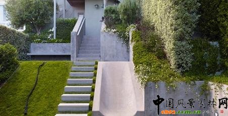 客戶的三層極簡派現代住宅位于舊金山布埃納維斯塔公園附近,在建筑屋頂甲板上可以看到廣闊的城市景象。當我們在2004年開始這個項目的時候,后院給人感覺空間尺度很小,具有陡峭的斜坡,不規則的角度,楔形的一片片雜。場地長44英尺,最寬處25英尺。在南邊,因其以沿街的城市擋土墻為界,任何階地都需要自己的扶壁支撐;在北邊可被周邊房屋看到的空間則需要一個高大的隔板。盡管這些障礙限制了空間的延伸,客戶依然決定要探索一些方法,使這塊地成為一個可供他們雙胞胎女兒使用的戶外活動空間,這樣他們就不用像以往那樣開車帶孩子們去操場或是讓孩子們在室內活動了?蛻敉瑫r也希望這個活動空間俯視效果也能同樣具有趣味性。