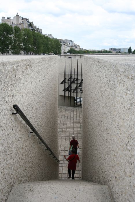 在地面的花園中,我們僅看見兩處位置對稱的樓梯通道,引導參觀者下行。狹窄的樓梯只能容一個人通行,它把人們引向一座近似三角形的下層式中庭。中庭四周都是高大厚重的混凝土墻體,墻壁沒有絲毫的縫隙,如同整塊巖石直接開鑿而成。據說當年建筑師從法國各地收集小石子,然后將它們研磨粉碎,制成混凝土原料。樓梯正對著的,是一個緊貼地面的低矮洞口。洞口前面矗立著一道象征荊棘的黑色鐵柵欄門,似乎阻擋所有想從這里逃離的人。穿過它能就是塞納河,這是通往"另一個世界"的唯一開口。