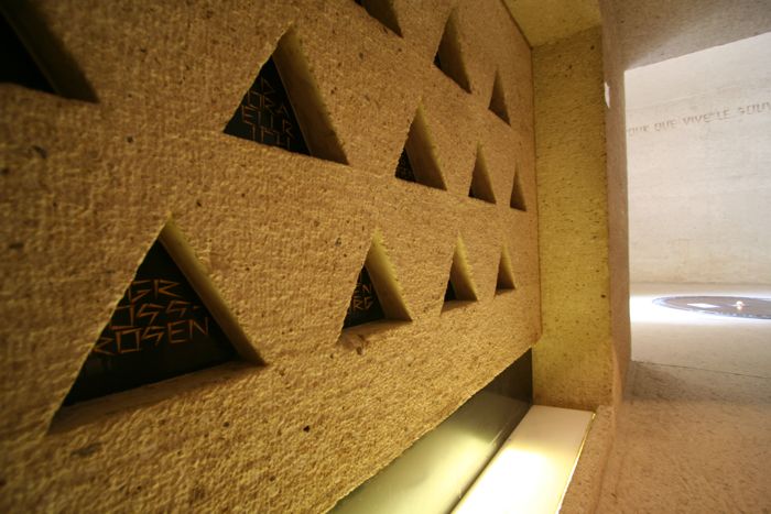 "被驅除者紀念堂"體現了集中營的所有特征:走道狹窄、樓梯局促、大門沉重以及視野受到局限只有局部天井,根本無法看到室外。這是一個真正意義上的紀念碑,它的詩化的表現比簡單羅列的事實更接近歷史的真實,也更具感染力。