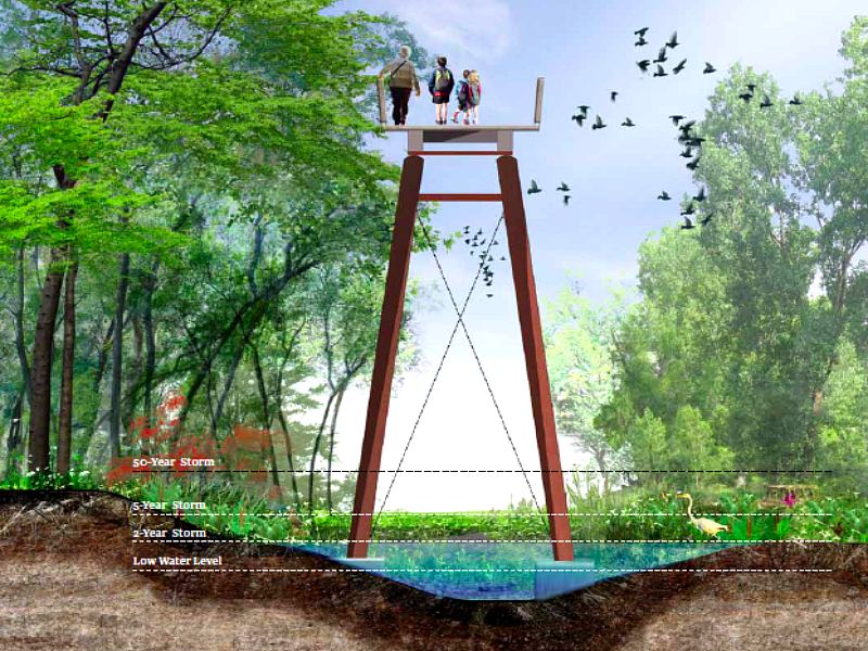 河的東岸,人們步行在高架步行道(Elevated Walkway)上欣賞重建的濕地,這種高尺度的步行道讓人們能夠更接近在樹林間穿梭的鳥兒。