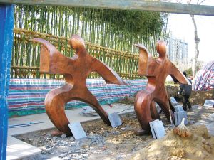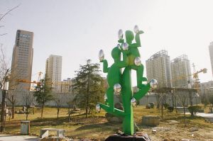 《綠色希望》地點:裕華路與中華大街交叉口。抽象人物高舉綠色種子,整體形成一棵大樹的形象,表現了一種綠色人文精神和對建設綠色石家莊的美好愿望。