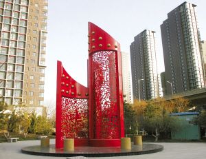 《春花》地點:槐安路與談固南大街交叉口。這座大紅色的雕塑以無極剪紙、窗花為題材。主體框架強調現代氣息,三面旋轉組合同時可以達到四面觀賞效果。