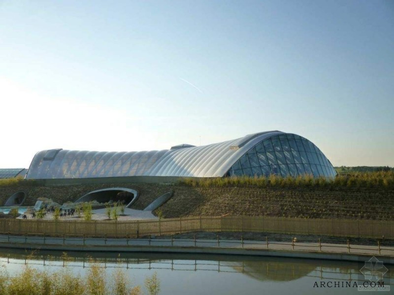 項目的最大挑戰是如何在這樣一個人工景觀中植入大型的用于支撐整體建筑的結構。建筑表皮采用多層可充氣式透明薄膜,其三角拱頂橫跨35米,高度在13到16米之間不等。上部純色的支撐結構包圍了整個游泳池,在此基礎上形成的綠色外墻承載流體,有利于提高建筑節能效率。