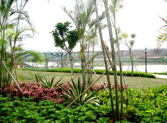 大綠地、公園的建設來推動社區開發的地產理念 陽光、流水、草灘、高爾夫、棧道、白墻麗瓦西班牙的濃郁風情 ·大量體育設施的布置、以提供運動場所: a.足球、網球、籃球、羽毛球和門球場; ·自然生態的公園設計、以提供綠色開放空間: a.燒烤區; ·水前空間的開發、以提升湖濱環境: 充分利用濱水優勢,營造舒適宜人的濱水休閑景觀,滿足游人的親水特性。通過對公園水岸的疏理,創造各種不同的水前空間。 a.大型開放露天劇場,可做表演區,沿等高線布置有坐墻; ·三太子廟的改造設計、以保留歷史文化遺產: 三太子廟作為現有文化遺產,將加強對其保護和有利開發,一方面,需要做防洪防水處理,避免其再次被淹;另一方面,將配齊其外部配套設施,增強其在民間的作用和休閑空間的利用。