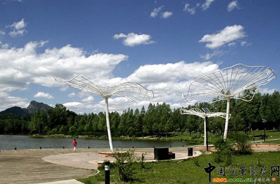 ![]() ![]() 。2)東南岸的是一處木石鋪裝相結合的生態廣場——碧葉連天,蛙聲四起。廣場上三枚碩大的金屬網制的荷葉撐起一片天,葉下、湖邊一群可愛的青蛙也來休閑散步。人們既可以在荷葉下休憩、玩耍,也可與蛙兄們相依相伴。整個環境既寓現代感,又樸實無華,讓人們真正感覺到自己是自然界中平等的一員,與自然大家庭中的其他成員和睦相處,才是最終達到協調發展,共存共榮的目標。