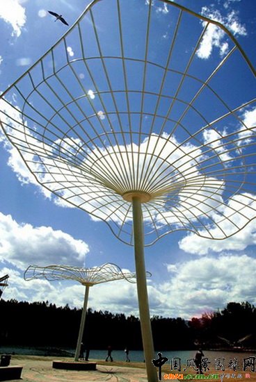 ![]() 。1)西岸的是一個下沉的音樂廣場,稱為“蝶戀花”。因為廣場看臺的形狀猶如綻放的花朵,而其上用于遮陽的是三只栩栩如生的鳳蝶。在這里人們可以舉行一些露天的演出活動。廣場的靠水一側又設有兩道近水的木棧道,以供人們親水之用。勝日里棧道一側的噴泉啟動,形成罩在棧道上的拱券,增添了游湖玩水的情趣。