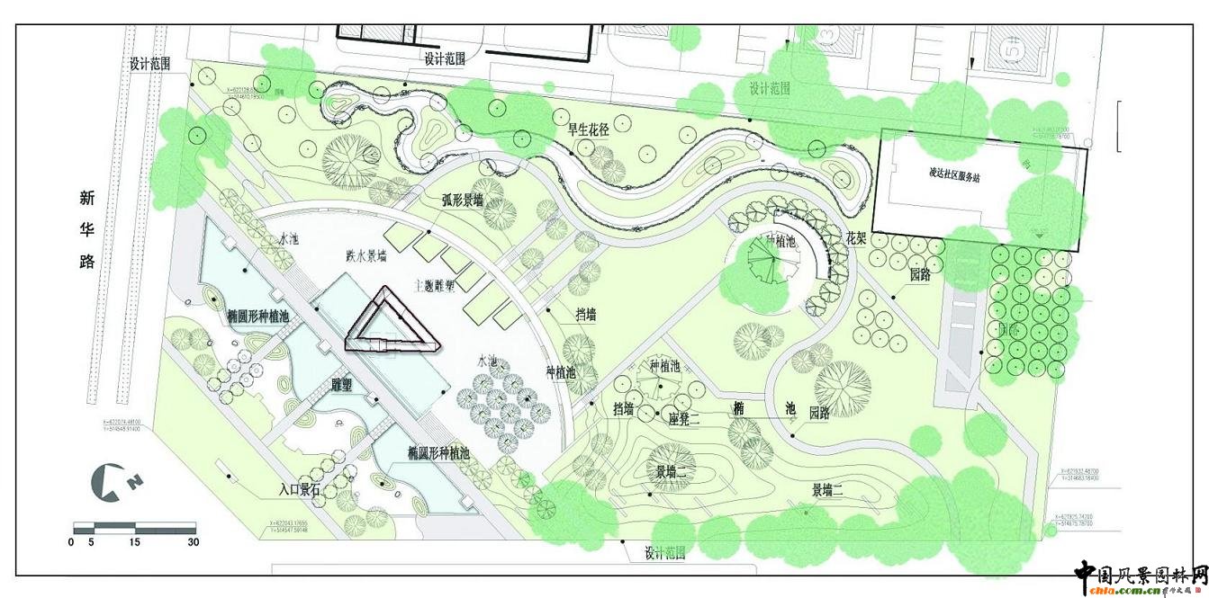![]() 中國風景園林網訊 新華園位于新疆庫爾勒市區新華路與石化路交叉口處,屬于城市公共開放型綠地。由于極度干旱的庫爾勒市年降雨量僅為50mm;敷地中原有一水渠通過;交通組織與綠地的關系等等問題需要同時考慮...... 在這種錯綜復雜的前提條件下,開始了我們的工作。 首先,在空間劃分上采用地形及弧形景墻將其分為動和靜、鬧和悠、規整和自然、兩種截然不同的手法解決“通過”與“停留”的矛盾關系。用雕塑、水池、廣場、臺階、垂直縱橫的通路,人工切開的地形、弧形景墻、樹陣、條形種植帶表現“動”、“鬧”區的空間特點,其中地面鋪裝上也力求表達多層次的空間氛圍。用曲線園路、旱生花徑、微地形起伏、景觀石料墻、木橋、休息廊架、自然種植的林地、3色變化的燒結磚表現“靜”、“悠”區的空間特點。通過細部的植栽及表達石灘地印象的旱生花徑將園中的“死角”空間(Dead Space)控制在最小的范圍。2種空間滿足多種城市功能和不同利用群體,賦予設計更多層面的社會需求。 旱生花徑是水渠的跡象追憶和對當地自然條件的尊重表白。景觀石料墻是對自然風貌的意向表達,疊水墻的片石,自然立面的臺階,四角圍合的樹池,藝術品化的石凳,小碎料石的園路勾邊,米石鋪面的光面石條鑲嵌等均反映了設計師的“刻意”追求。并希望通過細部處理傳達這樣一種信息——場地的藝術化。