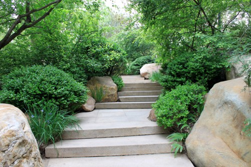 小路盤旋而上,植物與景石錯落布置于小路兩側