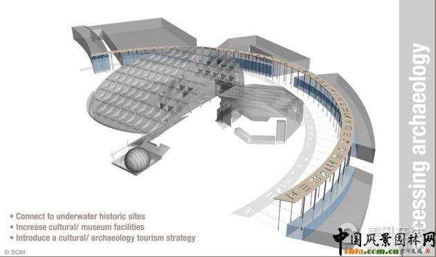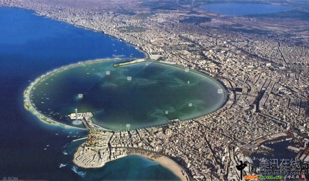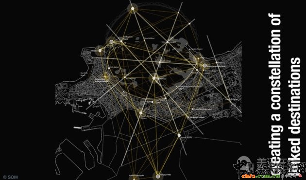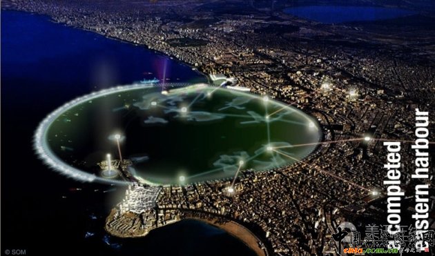 埃及亞歷山大港口中有許多在世界上有著非凡意義的考古遺跡,為了重建這個濱水區(qū)域并提高這一地區(qū)的交通情況,規(guī)劃將港口設(shè)想成了一個連接城市和城市歷史的環(huán)狀結(jié)構(gòu)。 機(jī)動性和流通性是設(shè)計的指導(dǎo)性原則。集中式的停車場減少了交通的擁堵,新的有軌電車、木板路、懸浮的碼頭、水上出租車提高了港口各部分的連通性。規(guī)劃計劃重建濱海路,并建造步行通道和遮陽街道使整個城市更具環(huán)保的特征。古老的亞歷山德里亞圖書館被擴(kuò)建到了新的博物館區(qū)中,這里將是文化和學(xué)習(xí)中心,并臨近水域。 規(guī)劃的綠色框架引導(dǎo)了整個開發(fā)區(qū)向可持續(xù)性和統(tǒng)一性的方向發(fā)展。新的防浪堤建造在港口周圍,它保護(hù)了內(nèi)陸不受海水的腐蝕并改善了通往考古區(qū)域的道路。建造在水邊的高聳的太陽能發(fā)電機(jī)在夜晚將發(fā)出微弱而穩(wěn)定的光,它喚起了人們對亞歷山大港法老時代的古老記憶,并引起了人們對于這個可持續(xù)性城市未來的想象。