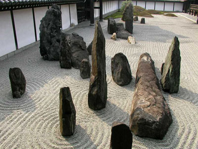 枯山水是日本庭園的精華,實質是以砂代水,以石代島的做法。用極少的構成要素達到極大的意韻效果,追求禪意的枯寂美。枯山水有兩種寓意對象,一是山澗的激流或瀑布,日本稱之為枯瀧;另一種是海岸和島嶼;池泉是微縮的真山水,池泉一般是園景的中心,枯山水與池泉都是在自然布局的水池中設溪坑石代表島嶼,與岸相連的駁岸稱中島按不同位置分別稱為龜島、鶴島、蓬萊等名,立在水中或砂中的巖石有更多名稱,在此不再贅述。