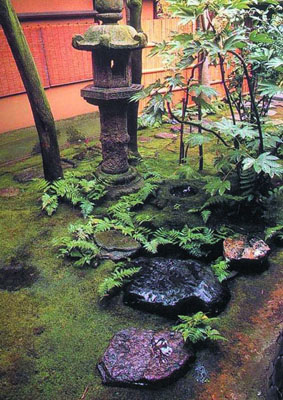 茶庭也叫露地是源自茶道文化的一種園林形式,至今茶庭的景觀作用己大于實用功能。茶庭式園林一般是在進入茶室的一段空間里,按一定路線布置景觀,以拙樸的步石象征崎嶇的山間石徑,以地上的矮寓指茂盛的森林,以蹲踞式的洗手缽聯想到清冽的山泉,以滄桑厚重的石燈籠來營造和、寂、清、幽的茶道氛圍。有很強的禪宗意境。