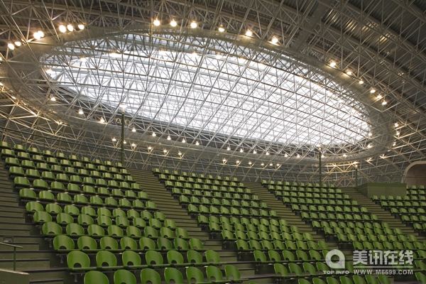 外墻可調(diào)節(jié)室內(nèi)環(huán)境 屋頂和墻壁的連續(xù)面被植被和人工土壤覆蓋,土壤中摻有由日本柳杉皮和柏樹皮。帶有10多種植物種子的土壤灑在各斜面上,斜面的最大角度為70度。開始的時候,僅僅只是一些黑色土壤。半年后,土壤中的植物開始生長了。在建筑的南面,植物最高覆蓋到20米的高處。北面因為直射光較少,植物最高只到4米處。這樣的植被溫室所引起的隔離效果很明顯。在最熱的夏季,體育館外溫度達到40度的時候,體育館內(nèi)大約才30度。一般來說,大型室內(nèi)場所即使在白天也需要人工照明。在這里,則通過3個大型的天窗來減少人工照明光線的能量消耗,以保證室內(nèi)所需的照明度。天窗的玻璃上貼有遮蔭層,用來減少太陽直接照射所提高的溫度,另外,安裝的天窗孔可進行重力通風。