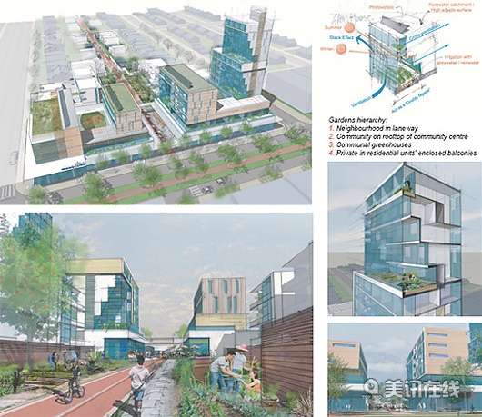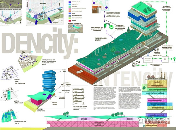 三等獎得主,來自溫哥華的Go Design Collaborative公司說:“在溫哥華的水路入口、服務區,工廠區和住宅區之間有不少沖突。為了保護公寓發展下的工業和農業用地,DENcity : INTENcity提出一個優化能源的大跨度方案,采用“層疊式”結構能允許無止境的結構重整和房屋居住。它將聳立在Maprole區,像一座燈塔,象征著溫哥華大膽革新的宣言。 除了以上獲獎的三個作品,評委團也平出8個榮譽獎: