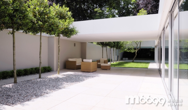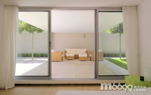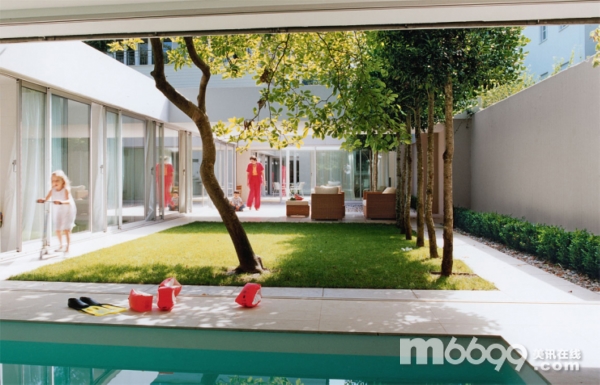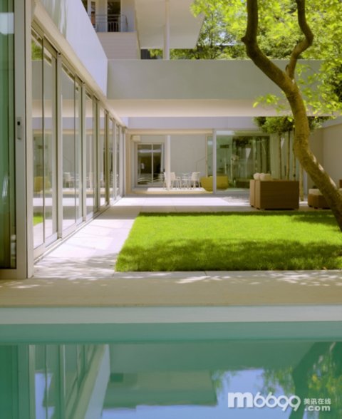 這座現(xiàn)代家庭住宅由建筑師MaxBrunner設(shè)計,建筑師仔細地考慮了每個細節(jié),讓住宅能給人帶來一種舒適的室內(nèi)外生活。住宅和幾個庭院、露臺相連。樓層高的窗戶和滑門能讓自然光線照入到整個室內(nèi),同時也為去往室外和泳池提供了更簡捷的通道。雖然天花板的高度只有2.45米,窗戶和白色的墻壁讓住宅看起來很舒適。用餐區(qū)位于住宅中間,和兩個庭院和一個帶頂?shù)钠脚_相連。所有的房間和戶外空間都按最簡抽象主義風格設(shè)計。另外,綠色屋頂?shù)脑O(shè)計也給人帶來一處不錯的地方。