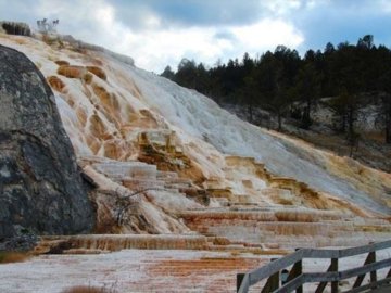 Mammoth Hot Spring是一處地質(zhì)景觀,象極了中國黃龍寺的風(fēng)景。一層層黃白色的巖石在水流的沖擊下,如一層層梯田層層疊疊而下。可惜水流好象枯竭了,風(fēng)景大打折扣。盡管如此,Mammoth Hot Spring附近有大片漂亮的山谷和荒原,夕陽照耀下的金色山谷金光閃閃,美不勝收。