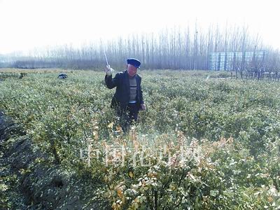 去冬的低溫使北京很多大黃楊遭受凍害,其葉片干枯而枝條尚綠,氣溫轉暖能萌發新芽。為使其盡快發芽,北京通開苗圃用小棍敲打干枯葉片,增加枝條光照量,促發新芽。而常規的修剪嫩梢弊端一是老枝枯葉無法去除,不能增加光照,二是要損失健康枝條,影響植株生長量。本報記者  駱會欣 攝
