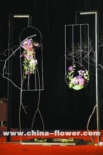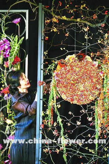 柔婉女子 大氣依舊 第一次接觸韓國知名花藝師金英珠,是在去年第七屆花之韻上海國際插花藝術(shù)展上,一場大氣淋漓的花藝表演,讓在座的觀眾不敢相信出自一位柔弱的東方女性之手。在本次花藝表演會上,金英珠延續(xù)了其一貫的大氣風(fēng)格,依然注重所有舞臺作品的組合連貫效果。作品完成后,既相互獨(dú)立,又有所聯(lián)系,成為一件組合“大作”。 金英珠的這場表演以中國傳統(tǒng)“方”、“圓”理念為詮釋核心,將其善用的大型金屬架構(gòu)再次搬上舞臺。主作品由三件作品組合而成,舞臺正中的作品用枯樹枝打底,樹枝被綁扎成放射狀懸掛于鐵架之上,上面附有各色花朵,顯得秋色斑斕。圓形內(nèi)里用五色雞冠花裝飾,形成半月形;向上延展的荷葉與向下垂吊的稻穗相互呼應(yīng)。圓形作品兩側(cè)是兩個(gè)長方形鐵架架構(gòu),其中包含著多個(gè)大大小小的圓形,十幾支各色繡球隨意懸垂其上,繡球修長挺擴(kuò)的感覺,輔助以一些藤類纏繞,呈現(xiàn)出一種深秋從容之美(如圖2)。 金英珠的作品以境界見長,其創(chuàng)意雖未見大的突破,但此次表演的作品,更加工于格調(diào)。其后一件作品中,對稱的兩個(gè)鐵藝架構(gòu),互為反正、相對而立,呈現(xiàn)出繁體漢字“門”的造型。其中寥寥兩根樹枝,便營造出庭院深沉之境界(如圖3)。整場作品中唯一一件用粘貼手法創(chuàng)作的架構(gòu),滿滿的紅豆黏在一個(gè)圓盤上,兩邊掛以沉甸甸的麥穗,懸掛在U型鐵架上,周圍遍布紅豆枝,秋色原野爛漫之美即刻呈現(xiàn)眼前,令人叫絕(如圖1)。