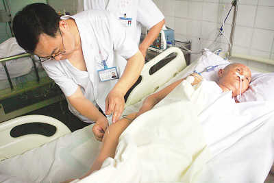 6月20日,四川省遂寧市一位醫護人員對汶川特大地震災區送來的傷員進行治療。