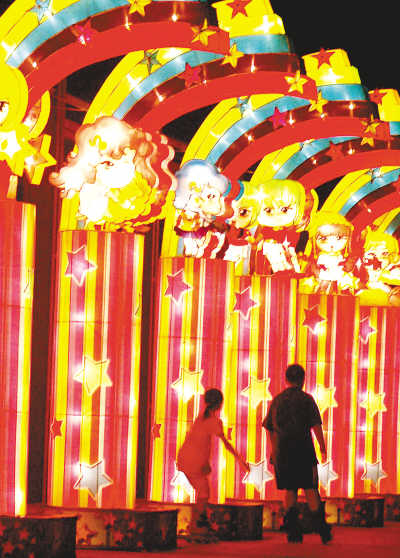 7月23日晚,通州運河文化廣場上的“奧運項目”主題彩燈與水中的倒影交相輝映。