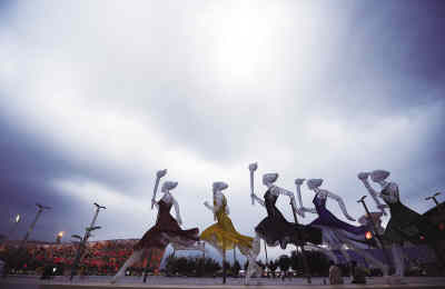 8月12日,夜幕降臨,北京奧林匹克公園華燈初上,格外美麗。 圖為奧林匹克公園的一處雕塑。