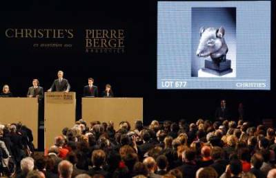 這次為期三天的法國時裝設計師伊夫·圣洛朗與其同伴皮埃爾·貝爾熱“珍藏專場”拍賣會,共有拍品七百余件,在一八六0年戰爭期間被英法聯軍劫掠走并流失海外多年的中國圓明園流失文物鼠首和兔首銅像屬于高價拍品之一。