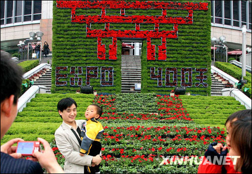 當日,即將揭幕的上海春季花展外景“世博鮮花墻”在上海中心城區徐家匯亮相。鮮花墻由中國主題館造型和倒計時400天字樣組成,表達了上海人民的“世博情”,提醒人們2010年上海世博會的腳步越來越近。