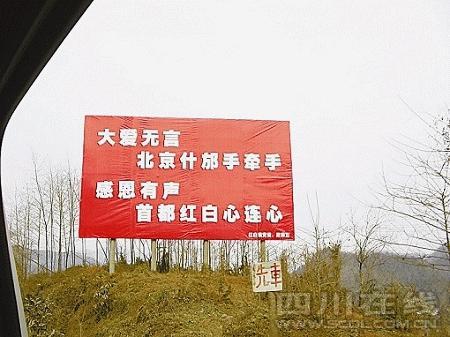 都江堰人掛出感恩的橫幅。新華社發