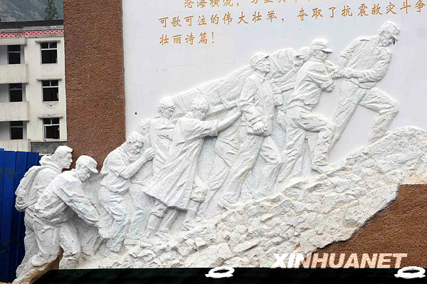 5月12日,紀念四川汶川特大地震一周年活動即將在四川省汶川縣映秀鎮舉行。這是活動現場的汶川特大地震記事墻,墻上的銘文記述了這場地震造成的巨大損失和中國人民奮起抗震救災的英雄壯舉。墻上的浮雕刻畫著救援人員解救被困群眾的感人一幕。新華社記者 饒愛民 攝