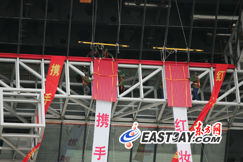 5月25日下午3時,上海世博會中國國家館外立面開始“上紅”。據(jù)了解,外立面掛裝過程將歷時兩個月,至7月25日,中國館將“穿”上大氣、經(jīng)典的中國紅“外衣”。