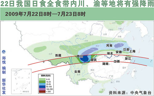 這次日全食在我國陸地范圍內共持續40多分鐘。日全食帶經過我國的西藏、云南、四川、重慶、湖北、湖南、安徽、河南、江西、江蘇、浙江和上海,共12個省、自治區或直轄市。日全食帶經過人口稠密的長江中下游地區,成都、重慶、武漢、合肥、杭州、蘇州和上海等幾個大中城市均可見全食。