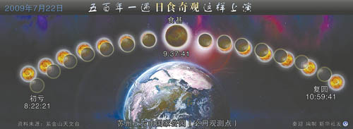 中科院紫金山天文臺研究員季海生介紹,這次日全食起始于印度,最早看見日全食的是印度坎貝灣(GulfofCambay)。日食帶穿過印度次大陸、尼泊爾、孟加拉國、不丹和緬甸,從中印邊境進入中國,從浙江和上海進入太平洋。在太平洋上,日食帶掃過琉球群島,并一直延伸到西太平洋的北庫克群島,在那里,太陽帶食而落。
