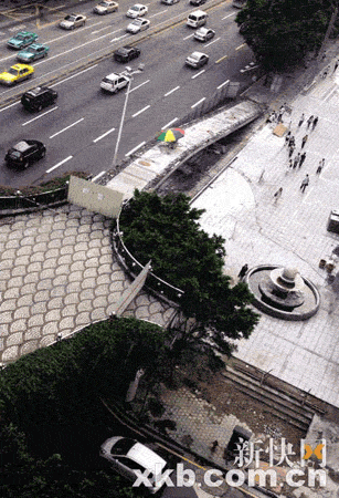 記者觀察發現,被拆的兩處橋腳長約三十米,一直延伸到粵財大廈的南門和東門,門與橋腳之間有十多米人行道空間。而天橋其它三個方向的5個橋腳,與人行道之間只有不足5米的距離!叭绻饦蚴菫榱俗呗贩奖,那為什么其它幾個橋腳不拆呢?”街坊胡阿姨說,可能原來的橋腳擋了大廈的財路、風水才被拆的。