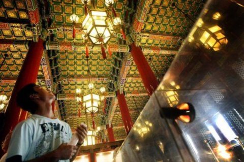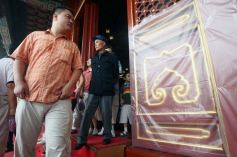 為防止游客觸摸,新油飾的大門包裹著塑料布