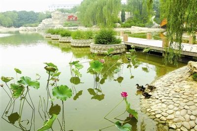 百余種花卉品種、40多萬株灌木、百萬平方米的綠地、帶來了四季有景的奇觀;30多只野鴨安家落戶,于是“野鴨島”就此誕生;自然良好的循環系統使環島的湖水清澈見底,湖中是悠然自得的魚兒,湖面是嬉戲追逐的野鴨。今天的天通苑將昔日的荒郊建成了一座新城,將昔日的荒野改造成生態的樂園,這里將成為天通苑的孩子第一本成長的“生態教科書”。