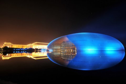 2009年8月27日晚,迎接國慶六十周年,國家大劇院景觀燈開始點亮。