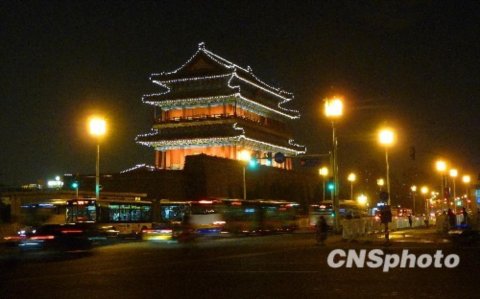 剛剛改造竣工的北京正陽門節(jié)能夜景照明首次亮燈。新型燈源柔和明亮、將正陽門妝扮的玲瓏剔透。