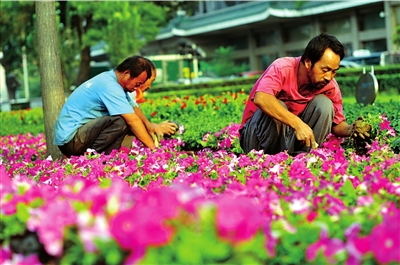 昨(1日)天,在交通部對(duì)面的綠化帶里,20多位園林綠化工人正在修剪枝椏,空地上擺滿了小花盤,紅黃綠紫,顏色多樣,引來眾多市民觀看。市園林綠化局透露,根據(jù)國(guó)慶60周年北京花卉景觀布置規(guī)劃,全市將布置各類花卉共達(dá)4000萬盆。其中,天安門廣場(chǎng)將在十一期間設(shè)置一組中心花壇,長(zhǎng)安街沿線步道將布置22處立體花壇,面積達(dá)十萬余平米。其中,天安門廣場(chǎng)中心花壇作為主花壇,現(xiàn)暫定將安排在天安門中心廣場(chǎng)偏南10米的位置,呈圓形,突出“普天同慶”的主題。花壇直徑將達(dá)40米,中心主花籃高達(dá)13米,將選用真假花卉結(jié)合的方式,主選花種有粉矮牽牛花、小黃菊等。市園林綠化局負(fù)責(zé)人表示,主花壇的設(shè)計(jì)和布置還未最終確定,將在國(guó)慶游行排練之后,按實(shí)際需要做相應(yīng)的修改和調(diào)整。