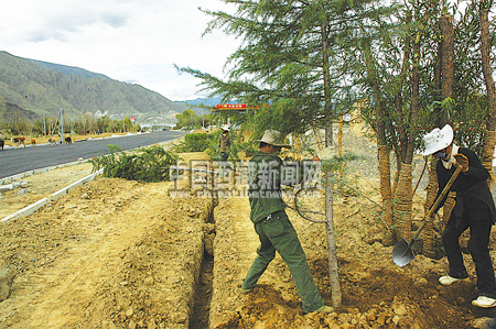 備受矚目的拉薩市“西大門”318國道沿線環(huán)境整治工程(“西大門工程”)進展順利,昨日下午,記者在施工現(xiàn)場看到,道路兩旁的綠化景觀樹已栽種大半。負(fù)責(zé)綠化工程的西藏古堰園林工程有限公司的楊先生告訴記者,預(yù)計在9月20日左右,10萬棵樹將全部栽種完畢。屆時,綠陰掩映的拉薩“西大門”將進一步提升拉薩城市形象。